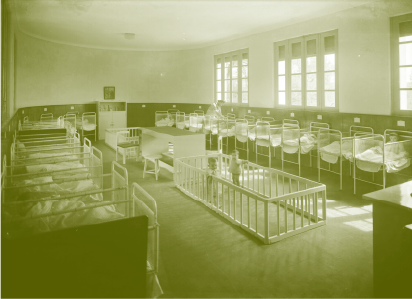 Fotografia Alvão, Lda., [Abrigo dos Pequeninos, Porto: Dormitório da creche]. PT/CPF/ALV/015938. Imagem cedida pelo Centro Português de Fotografia.