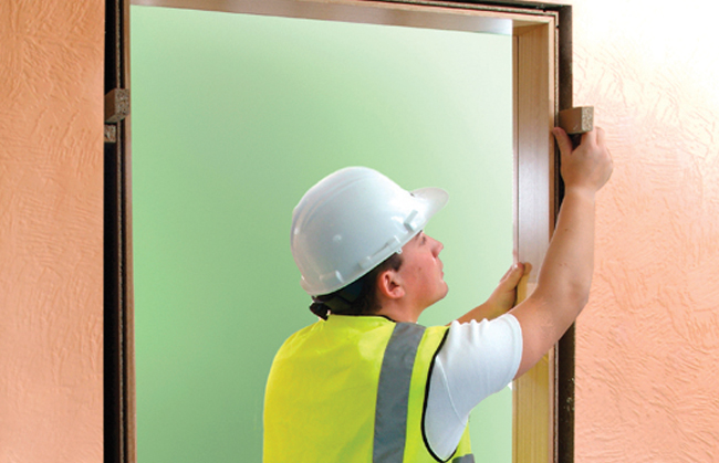 3. Ajustar o aro à abertura de construção. Colocar tacos entre o aro e a parede, ao nível das dobradiças.
